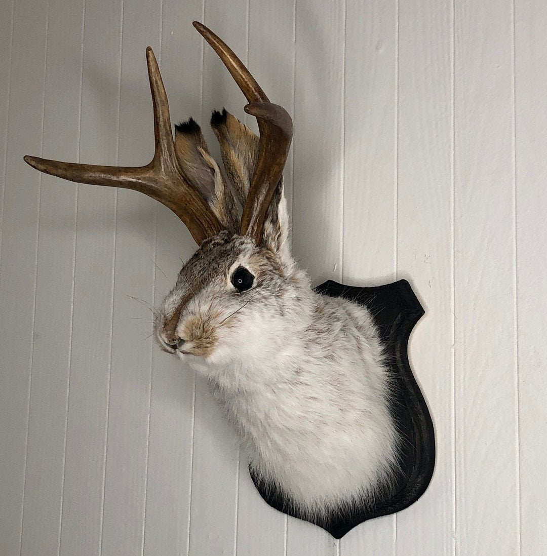 This is a beautiful Taxidermy Jackalope wall hanging Rabbit. He is just gorgeous and sure to be a hit with your buddies! He has a metal hook on the back for hanging. This is a very nice looking mount.