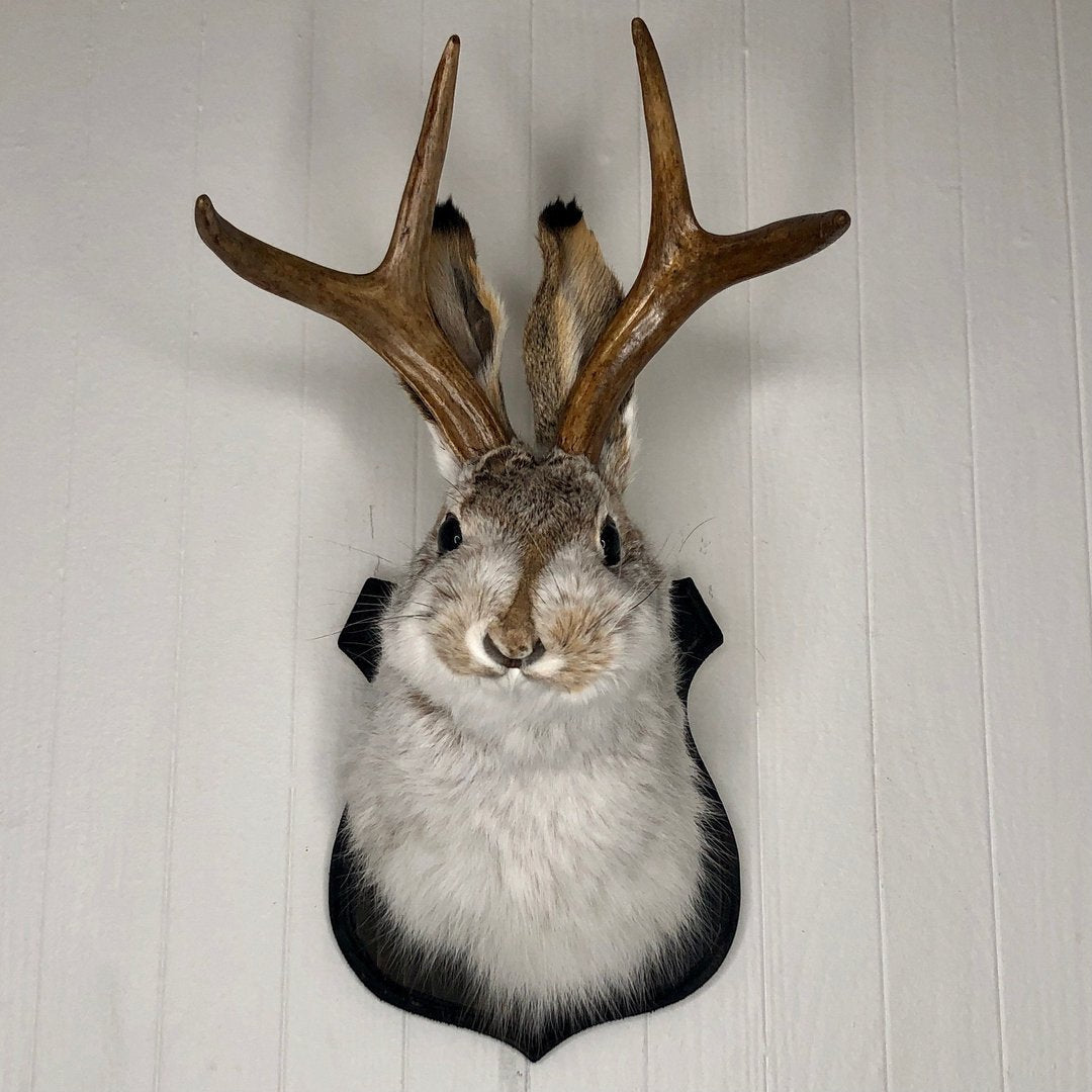 Ahh, the ever-elusive and mythical jackalope! No home is complete without one! Mounted on a solid rustic wood plaque, ready to hang on the wall, a Jackalope is a mythical piece of taxidermy, consisting of a taxidermy rabbit's head and real deer antlers. A great addition to any taxidermy collection.