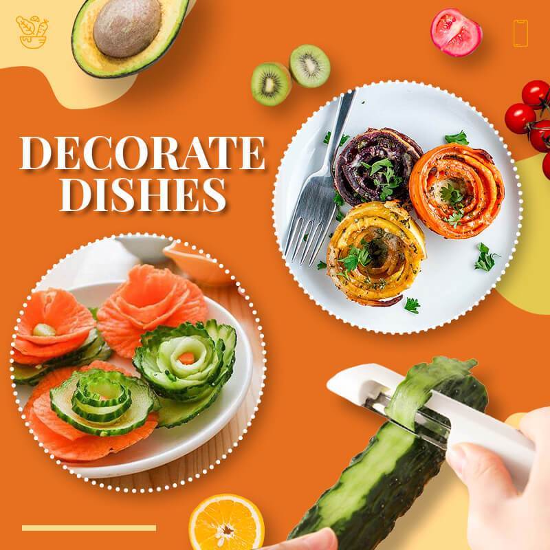 Peel fruit or vegetable, place in VEGETABLES CURLER , rotate clockwise and after twist ribbons into flowers. It is very easy to make your table unique in a few minutes. -