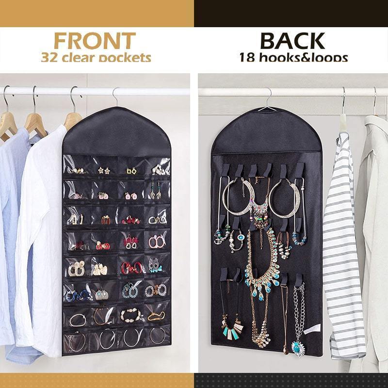 There are 32 pockets on the front and 18 magic tape hooks on the back. Never waste another minute sorting or searching for misplaced jewelry.