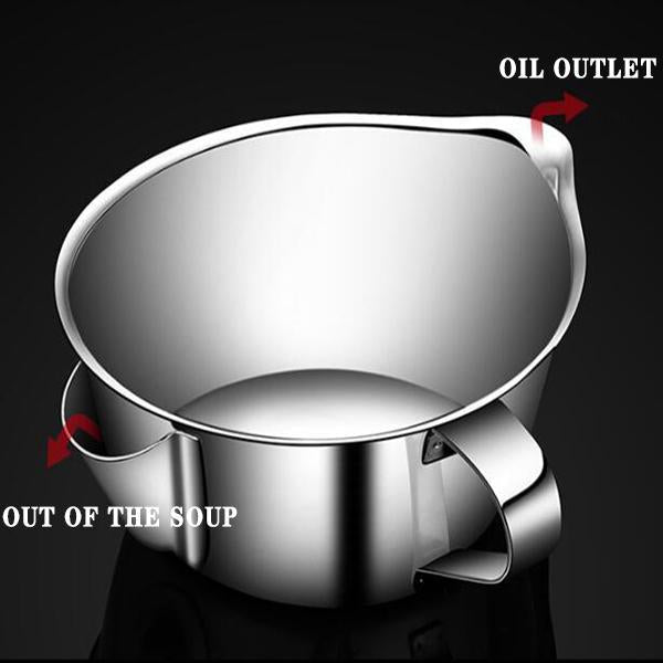 Because the oil and water are incompatible, and the density of the oil is less than the physical density of the water, the oil is floating above the soup, and the outlet hole is placed at the bottom of the bowl. When dumping, the broth flows out from the small hole. The grease is separated from the upper layer to achieve the separation of water and oil. -